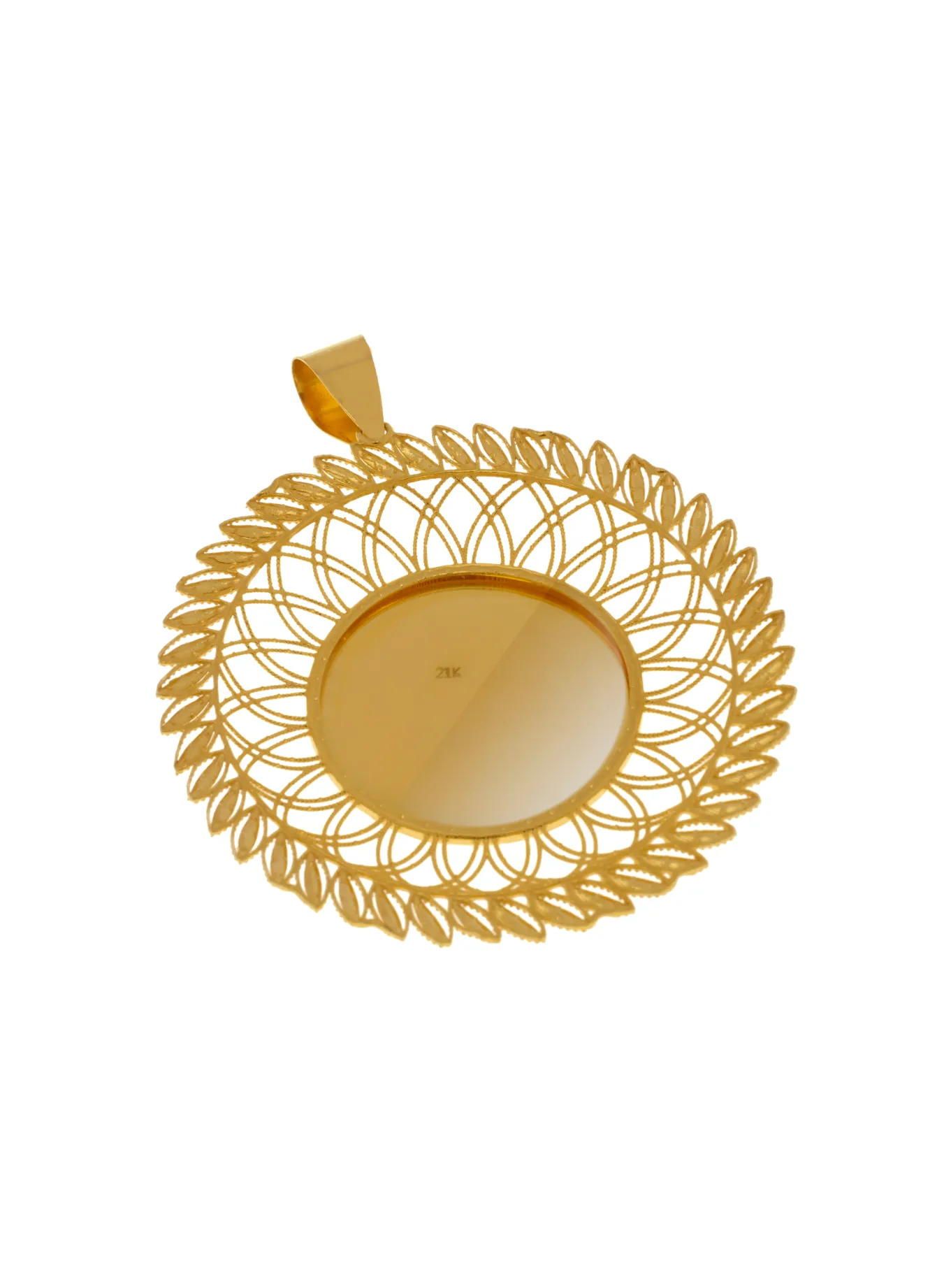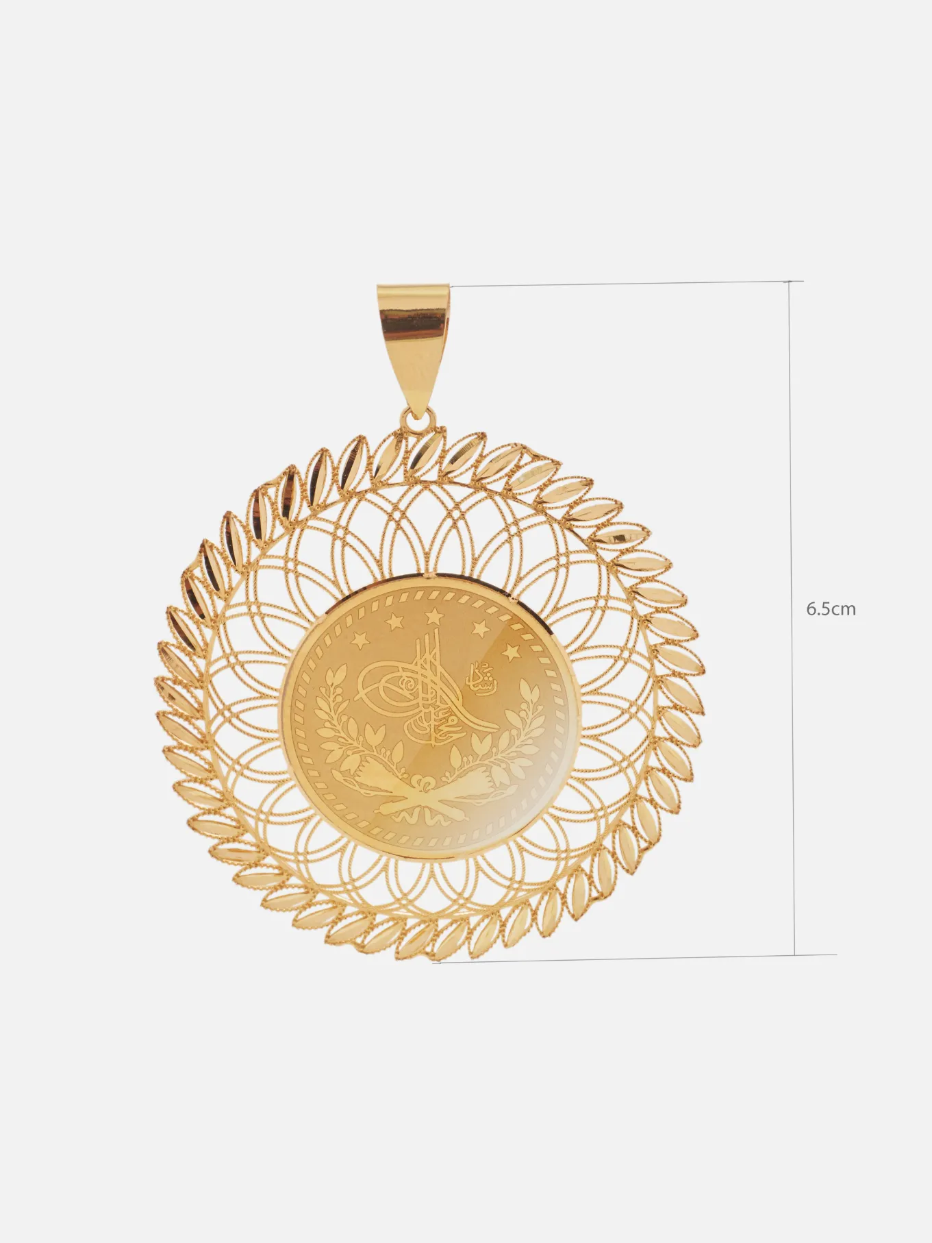 Framing the Constantinople coin, an elegant silhouette of designs circle around, forming a floral structure close to the complexity of a dahlia flower. The outer circle is decorated with marquise cut gold, defined with an elliptical outline of miniature beads. There is a stunning contrast between the bold, dazzling ellipses around the outer layer, and the subtle, delicate beaded lines of elaborate floral patterns across the inner frame. The core of the pendant is composed of a solid, glossy gold surface with precise engravings of the Constantinople hallmark. The carved hallmark on the pendant is a shade lighter than the setting of the coin, allowing the grand design to be distinctive. Pendant 7072 possesses a unique blend of high quality, precious gold and excellent craftsmanship seen through the combination of textures and complicated shapes that intertwine together to form the astounding frame around the centre coin. The pendant bail is fitted for any preferred chain, with a classic style and ideal size.